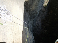 Fem un mosset ràpid i algun bricoconsejo de Amancio. I ja marxem entre la vegetació en busca de la capçalera del Salt de Boter. Fem un primer ràpel on cabem perfectament tots, i on comença ja la cascada de 215m la més alta de Catalunya. Un ràpel de 19m on fem cap a un passamà penjat a 196m de terra, realitzem un ràpel de 98m, amb un petit pèndul per poder entrar a una cornisa amb un gran passamà de cadena i per finalitzar un altre ràpel de 98m per arribar a la base de la cascada.