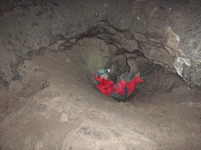 El mateix dia, i gràcies a la masseta i l’escarpi que portavem i una antiga llauna d’atun que vam trobar-hi, bam aconseguir desobstruir dues gateres, la primera una finestra de roca, que possiblement algú petit hauria pogut passar antigament, i que simplement vam eixamplar, i la segona una gatera amb forma sifònica de terra a la part de sota i roca a la superior, aquesta va ser la que ens va donar més feina, ja que només és podia veure un espai on passava el bras i prou, però que va ser suficient per passar la càmara de fotos a l’altra banda i veure que hi habia continuació, d’aquesta manera ens va motivar a treure terra amb la llauna d’atun, i finalment vam poder creuar-la, el pas el vam anomenar la gatera de la xona de la vaca…