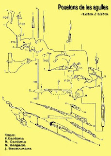 Anem a sopar i a veure el Barça, on després anem dormir a Montserrat. De bon mati sortim des del coll de Can Maçana carregats amb tots els trastes en direcció a la zona d’Agulles concretament al refugi Vicent Barber per realitzar l’Avenc dels Pouetons, un altre de roca conglomerada, però amb més formació que l’anterior. Comencem la visita i a la cota -105m trobem una replica la Moreneta, continuem fins a la cota màxima -123m. i una altra vegada cap a fora.