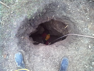 A primer cop d’ull vam veure que les parets del pou d’entrada eren prou solides per garantir un mínim de seguretat, però calia treure els grans blocs que estaven encastats per poder fer pas i explorar-lo. Així que després de treure una mica de terra del voltant vam anar pujant un a un els blocs que obstruien el pas.