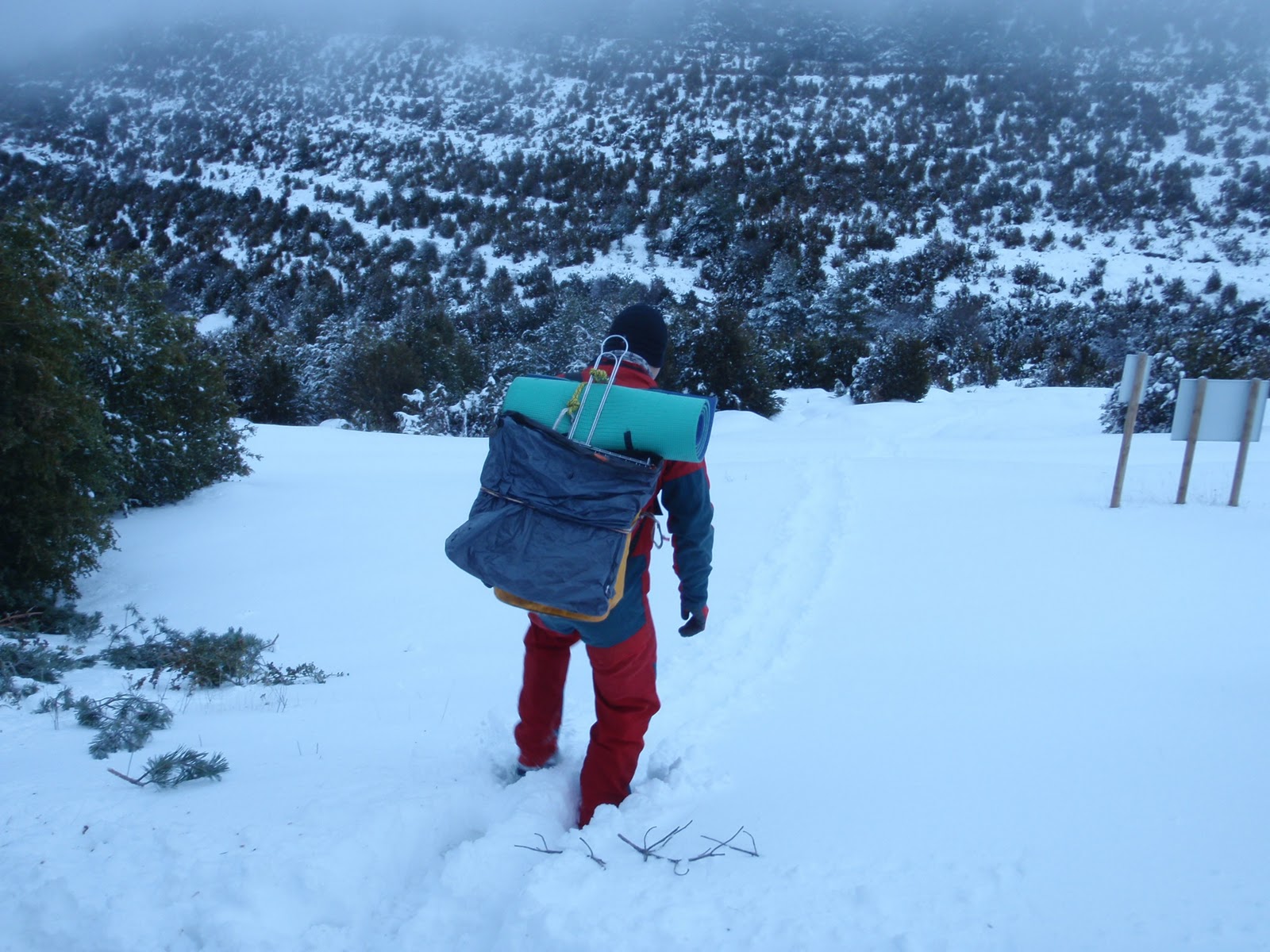 El panorama us el podeu imaginar, no anàvem preparats per caminar per tanta neu, i menys per portar tot lo fato de dormir i mejar fins al refugi, així que vam tenir que improvisar en los makutos d’espele i cordinos i mosquetons per penjar-hi el material que no cabia a dintre.