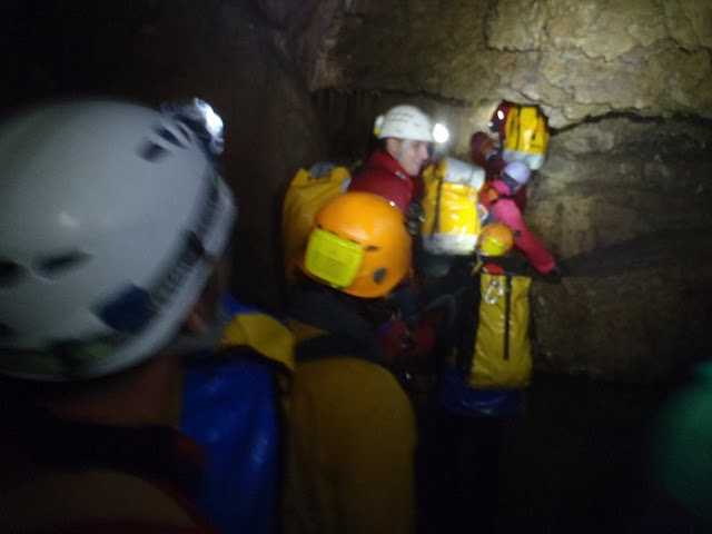 Deixem el Gran Canyo per continuar per unes galeries superiors, la de les Marmites. Possiblement la part més complicada, ja que tens de passar per la fissura del Shunt de la Hidalga, de difícil localització. Arribem a sala Princep de Viana, passem per una gatera i ja estem al Túnel del Vent, el superem amb flotadors i matalassos inflables.