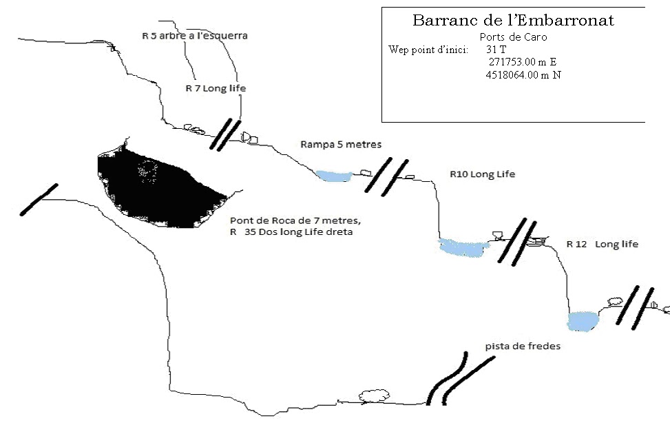 Com que no he trobat cap ressenya (segur que en hi ha alguna però jo no la he trobat) adjunto un petit croquis que pot servir si algú el vol anar a fer. El croquis arriba fins la pista de Caro a Fredes, encara que el barranc es pot fer fins la pista del Regatxol el tram de baix de la pista no te interès tècnic fins que s’arriba quasi a la pista del Regatxol amb unes gúbies molt ben formades,en un petit ressalt d’uns 4 metres que dona a un olla on es obligatori mullar-te.