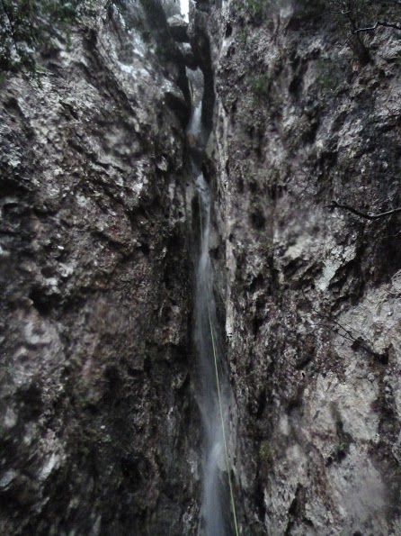 Deixem el cotxe al encreuament de les dos valls i entrem a peu, en una hora i mitja som al primer ràpel. Fem tot el barranc sense problemes, i comprovem que es pot fer amb molta més aigua, ja que els dos ràpels més delicats son els de vint-i-cinc, i com que son tan estrets pots rapelar fent oposició i sense tocar l’aigua. L’única dificultat es arribar-hi, ja que tens que creuar tres cops el de les Carroveres, amb molt més cabdal.