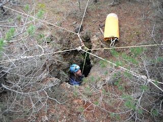 i comprovem que no te continuació. Sortim i decidim provar sort al Avenc del Trípode, que no esta molt lluny d’allí, munte’m un entramat de cordes aprofitant cinc pins, ja que tots son petits, entrem a l’estret avenc que ja hem batejat com «mini-crisi», i desprès d’una bona estona remenant, podem comprovar que, com ja era d’esperar, en la seva exploració no es van passar res per alt.