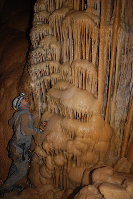 En un punt d’aquest caos de blocs podem accedir a un pouet molt concrecionat i una saleta molt bonica i amb un petit llac. Continuem davallant diferents resàlts i superant diverses estretors, algunes de elles han sigut desobstruïdes. Finalment arribem a la capçalera del pou de la butxaca(P-10) que ens deixa en una sala mes ampla (sala del peluquero de Ben Laden) a la cota de -100 m. A la sala també podem accedir per la via de les gateres evitant baixar el P-10.
