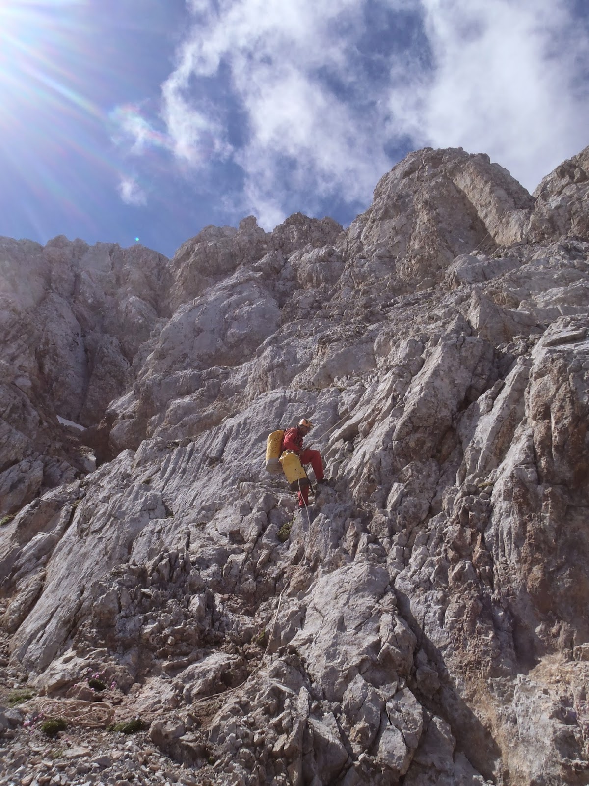 Ens despertem a les 11’45 hores i esmorzem bé i a les 12’45 arranquem, i anar pujant, hi han tirades bastant llargues, 80, 70, 60 etc… Com en deixat garrafes a les xorreres d’aigua, anem bevent d’allí. 22’45 hores i ja estem fora i altre cop boira que als tres metres ja no es veu res. Remuntem els 60 metres que ens falten per arribar d’alt a la Cornisa – Torre de la Palanca, anem guiant-nos una mica per l’instin i algun reflectant que es veia de quan en quan. Arribem al Refugi i comentem la alegria en Nando i Dani -700 metres i campament muntat. Olé!