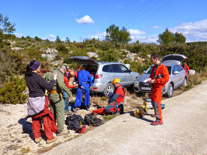 Ens trobem amb dos companys que surten de Calobres i ens fan un resum del que ens anem a trobar i la gent que encara queda dins de la cavitat , sense mes ens anem a l’interior de forma organitzada i intercalant a la gent amb menys experiència .