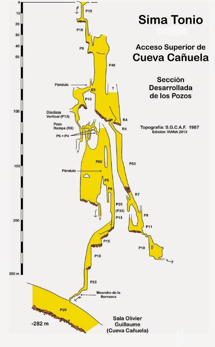 avanç d’arribar a l’últim de 20 es pasa per un meandre on l’aire es nota cada vegada més fort. Per últim fem el famós pou volat de 20 on dona a la sala Olivier Guillaume, ja a la cova cañuela, aquesta sala te 350 metros de llarg per 120 metros de ample.